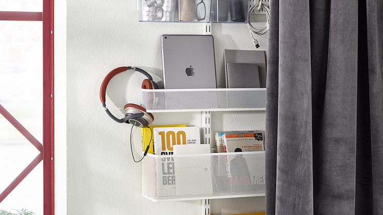 Tips: "Gjenstander som brukes daglig, og som må være lett tilgjengelige, for eksempel fjernkontroller og ladere, må ha bestemte plasser, ellers får de raskt føtter. Anskaff en pen kurv som står fremme eller velg en egen plass i bokhyllen til formålet. Det viktigste er at alle i familien vet hva som gjelder. En annen god måte å få småting unna på er å montere en grunn vegghylle som gjemmes bak en gardin eller et forheng."