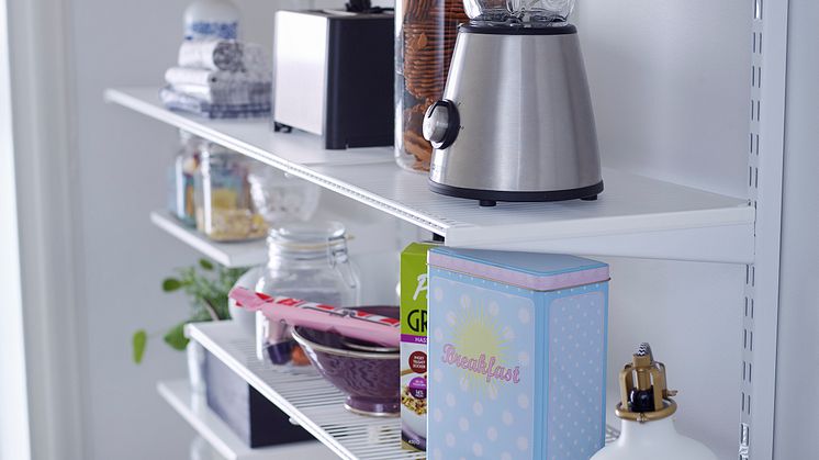 Tips: "Jobb i høyden! Dropp tavler på kjøkkenet. Sats i stedet for på vegghyller, som sluker husholdsapparater og kjøkkenutstyr. Hvis du har en dør inn til kjøkkenet – utnytt baksiden av den. Det finnes smarte hyllesystemer som er spesialtilpasset for dører og lett kan festes eller henges på døren. Rydd i kjøkkentingene og prioriter utfra det du bruker oftest. Hvis du lager smoothie hver morgen, skal blenderen plasseres lett tilgjengelig. Tenk også på at alt som står fremme på kjøkkenet lett trekker til seg fett og støv, så med færre gjenstander fremme blir det lettere å holde rent."