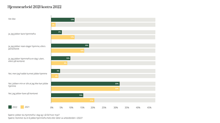 I året som har gått, har det vanligste vært å jobbe hjemmefra noen dager i uken (16 prosent). Tendensen ser ut til å bli den samme i 2022 (18 prosent). 6 prosent sier at de utelukkende kommer til å jobbe hjemmefra det neste året. Til sammenligning gjaldt dette 12 prosent i 2021.