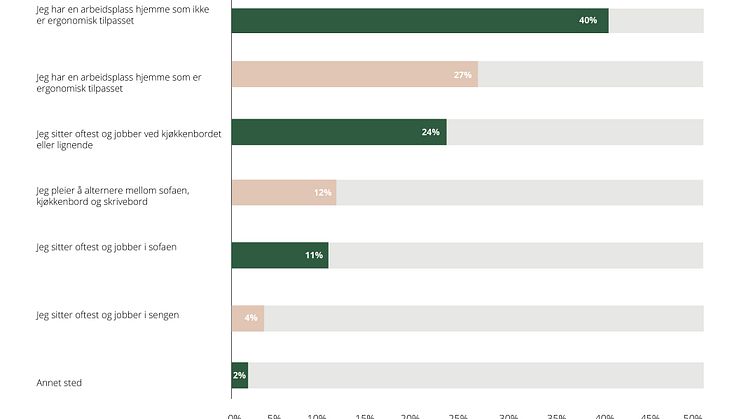 Undersøkelsen viser videre at 1 av 4 nordmenn (27 prosent) i dag har en ergonomisk tilpasset arbeidsplass hjemme, men at det også er mange (40 prosent) som ikke har det. En del sitter for eksempel ved kjøkkenbordet, noe som er dobbelt så vanlig blant kvinner (17 prosent) som blant menn (8 prosent).