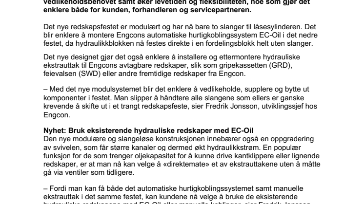 – Fordi man kan få både det automatiske hurtigkoblingssystemet samt manuelle ekstrauttak i det samme festet, kan kundene nå velge å bruke de eksisterende hydrauliske redskapene med EC-Oil eller manuelle koblinger, sier Fredrik Jonsson, og fortsetter: