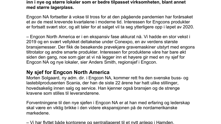 – Engcon North America er i en ekspansiv fase akkurat nå. Vi hadde en stor vekst i 2019 og en svært vellykket deltakelse under Conexpo, en av verdens største bransjemesser. Der fikk de besøkende prøvekjøre gravemaskiner utstyrt med engons tiltrotator og andre smarte produkter. Interessen for produktene våre har bare økt siden den gang, noe som gjør at vi nå legger inn et høyere gir med en ny sjef for Engcon NA og nye lokaler, sier Anders Smith, regionsjef i Engcon.