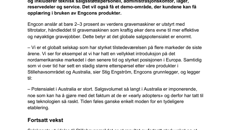 Selskapets utvidelse til Stillehavsområdet er et resultat av fortsatt sterk vekst og et ønske om å introdusere tiltrotatoren og EC-Oil-teknologien over hele verden. Per-Oskar Svedberg, som har ansvaret for det nye Australia-kontoret, har erfaring med Engcon både på det svenske og nordamerikanske markedet.