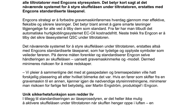 Det nåværende systemet for å styre skuffelåsen under tiltrotatoren, erstattes altså med Engcons standardiserte låsepanel, som har tydelige og opplyste symboler som veileder føreren. På denne måten forenkler og standardiserer Engcon selve håndteringen av skuffelåsen – uansett gravemaskinmerke og -modell. Dermed minimeres risikoen for å miste redskaper.
