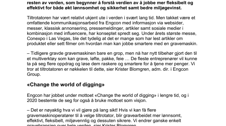 Engcon har jobbet under mottoet «Change the world of digging» i lengre tid, og i 2020 bestemte de seg for også å bruke mottoet som visjon.
