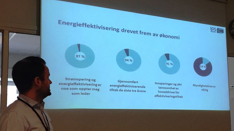 Thomas Jebsen, salgsleder i LOS Energy, åpnet seminaret med å vise funn fra en undersøkelse Wergeland/Apenes gjorde på oppdrag fra LOS Energy i fjor. Energieffektivisering står høyt på dagsorden i næringslivet og er drevet frem av økonomi. Hele 97 prosent av lederne i undersøkelsen svarer ja på spørsmål om strømsparing og energieffektivisering er noe som opptar dem som ledere i hverdagen. 91 prosent av de spurte oppgir innsparinger og økt lønnsomhet som hoved-driver for å gjøre energieffektiviserende tiltak.