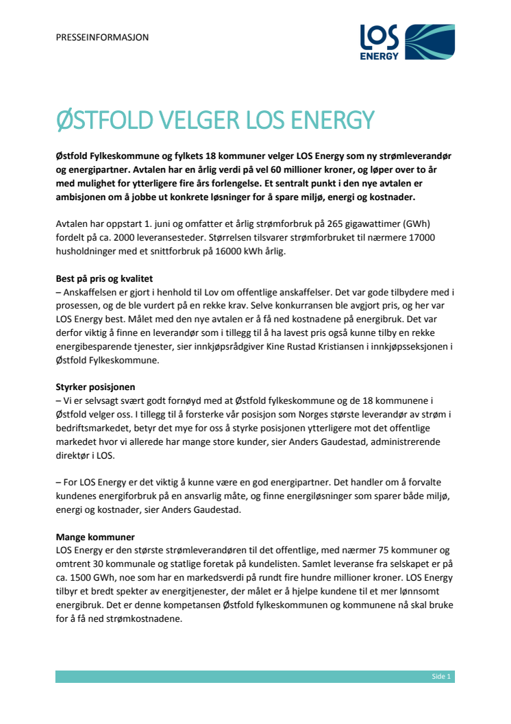Østfold Fylkeskommune og fylkets 18 kommuner velger LOS Energy som ny strømleverandør og energipartner. Avtalen har en årlig verdi på vel 60 millioner kroner, og løper over to år med mulighet for ytterligere fire års forlengelse. Et sentralt punkt i den nye avtalen er ambisjonen om å jobbe ut konkrete løsninger for å spare miljø, energi og kostnader.