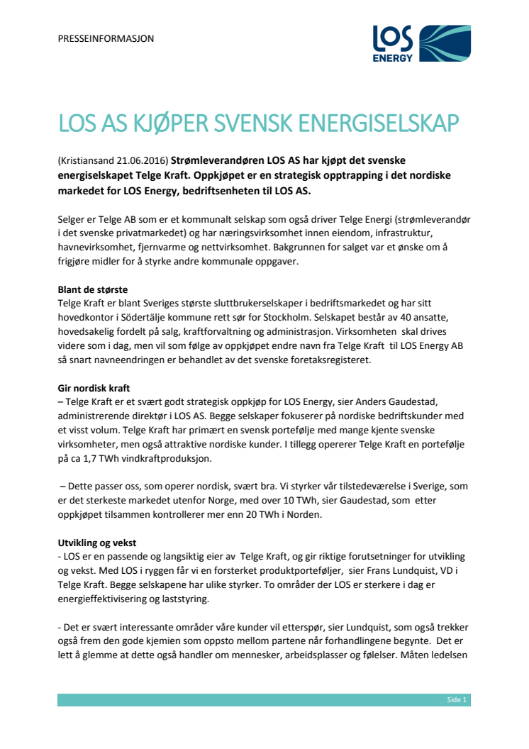 Strømleverandøren LOS AS har kjøpt det svenske energiselskapet Telge Kraft. Oppkjøpet er en strategisk opptrapping i det nordiske markedet for LOS Energy, bedriftsenheten til LOS AS.