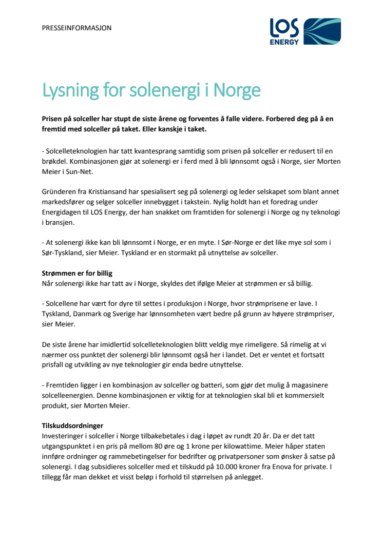 - Solcelleteknologien har tatt kvantesprang samtidig som prisen på solceller er redusert til en brøkdel. Kombinasjonen gjør at solenergi er i ferd med å bli lønnsomt også i Norge, sier Morten Meier i Sun-Net