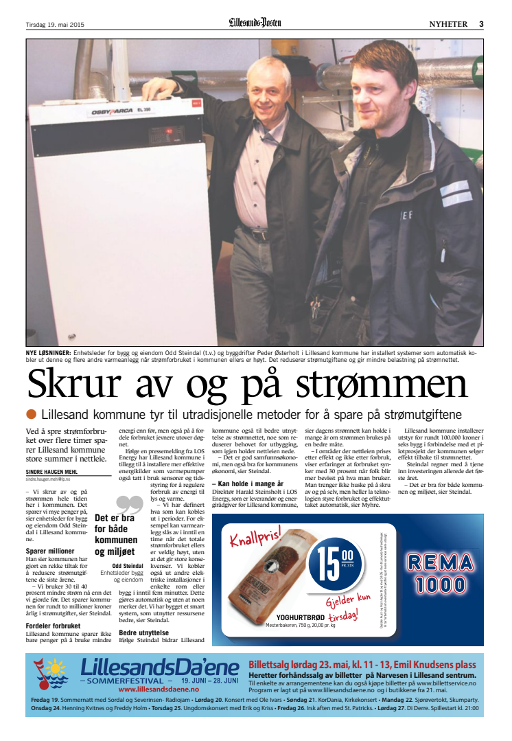 Presseklipp fra Lillesand-Posten 19.05.2015 - Sparer på stadig å skru av og på strømmen