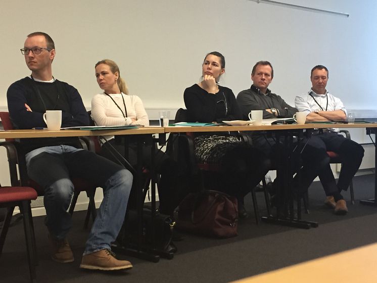 Energi-interessen er på topp. Fra venstre i bildet sitter Hans Petter Tegner, Trygge Barnehager, Line Holtet, Skolt Eiendom AS, Rikke Skaar, AGRI Kjøp, Finn Ivar Olsen, LOS Energy og Thor Geir Langåker, LOS Energy.