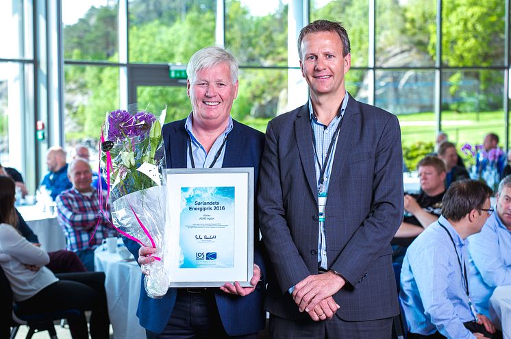 Direktør Peder Syrdalen i ASKO Agder (til venstre) takker Anders Gaudestad, direktør i LOS for kåringen av Sørlandets Energipris 2016.