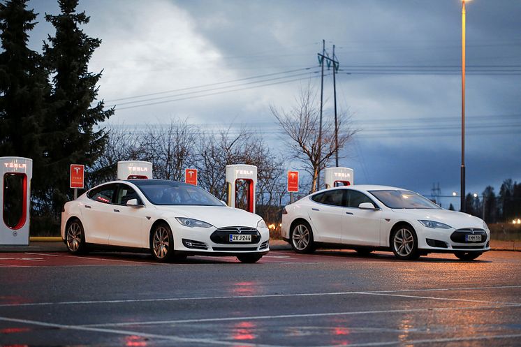 Illustrasjonsbilde fra Paimio , Finland - 14 november 2015 : To hvite Tesla Model S biler lades på Paimio Tesla Supercharger stasjonen om natten . Tesla ladestasjoner lader opptil 16 ganger så fort som ordinære ladestasjoner.