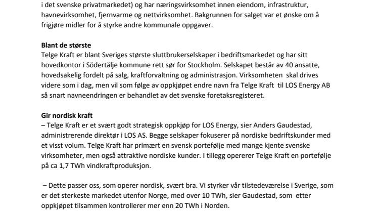 – Telge Kraft er et svært godt strategisk oppkjøp for LOS Energy, sier Anders Gaudestad, administrerende direktør i LOS AS. Begge selskaper fokuserer på nordiske bedriftskunder med et visst volum. Telge Kraft har primært en svensk portefølje med mange kjente svenske virksomheter, men også attraktive nordiske kunder. I tillegg opererer Telge Kraft en portefølje på ca 1,7 TWh vindkraftproduksjon.