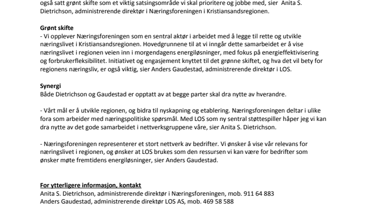 - Vi opplever Næringsforeningen som en sentral aktør i arbeidet med å legge til rette og utvikle næringslivet i Kristiansandsregionen. Hovedgrunnene til at vi inngår dette samarbeidet er å vise næringslivet i regionen veien inn i morgendagens energiløsninger, med fokus på energieffektivisering og forbrukerfleksibilitet. Initiativet og engasjement knyttet til det grønne skiftet, og hva det vil bety for regionens næringsliv, er også viktig, sier Anders Gaudestad, administrerende direktør i LOS.
