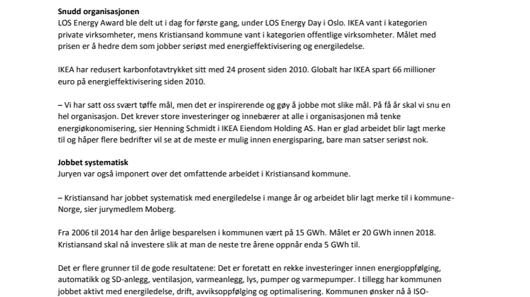 LOS Energy Award ble delt ut i dag for første gang, under LOS Energy Day i Oslo. IKEA vant i kategorien private virksomheter, mens Kristiansand kommune vant i kategorien offentlige virksomheter. Målet med prisen er å hedre dem som jobber seriøst med energieffektivisering og energiledelse.