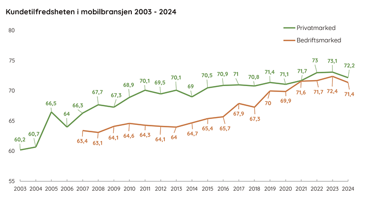 I en stadig mer digitalisert hverdag er velfungerende mobiltjenester avgjørende for våre daglige gjøremål, både på jobb og i det private. Men hvor fornøyde er vi egentlig med disse tjenestene? Den siste EPSI-målingen viser at tilbakemeldingene fortsatt er gode, men for første gang på seks år registreres en nedgang i kundetilfredsheten. Chilimobil inntar topplasseringen i privatmarkedet, mens Phonero for tredje gang på rad er bedriftenes favoritt.