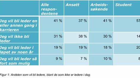 Ifølge undersøkelsen vil syv av ti bli leder på et eller annet tidspunkt i karrieren. Ca en av ti ønsker å bli leder så fort som mulig, og to av ti ønsker å bli leder i løpet av noen år. Mens den største gruppen, fire av ti, vil bli leder en eller annen gang i karrieren. Bare tre av ti sier de ikke vil bli leder.