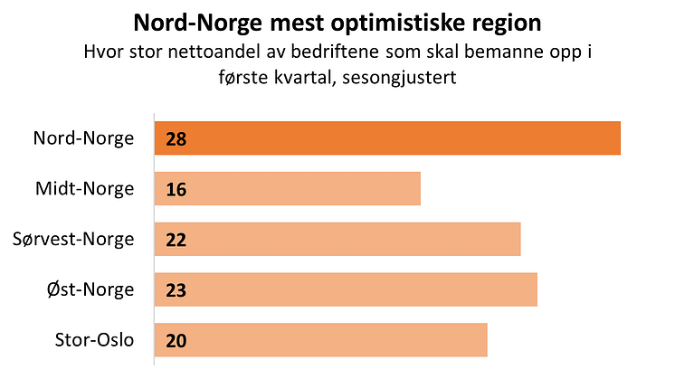Nord-Norge er den regionen hvor flest bedrifter skal øke bemanningen. Hele 41 prosent av bedriftene som ble spurt, forventer å ansette flere i første kvartal av 2023, mens 20 prosent forventer å bemanne ned. Det gir forventet netto bemanningsendring på 28 prosent, korrigert for sesongjusteringer. Det er det høyeste regiontallet i undersøkelsen, og over landsgjennomsnittet på +23 prosent.