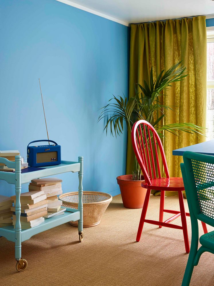 Selv om vi snakker om ton-i-ton og rolige, delikate paletter, må vi ikke glemme fargenes magiske kraft! Enten det er ton-i-ton, nabofarger eller en spennende og voksen komplementærfarge, slik som denne vakre grønngule fargen til den livlige blåfargen.