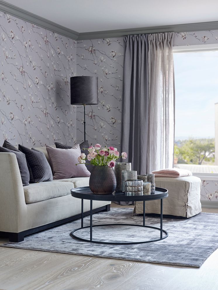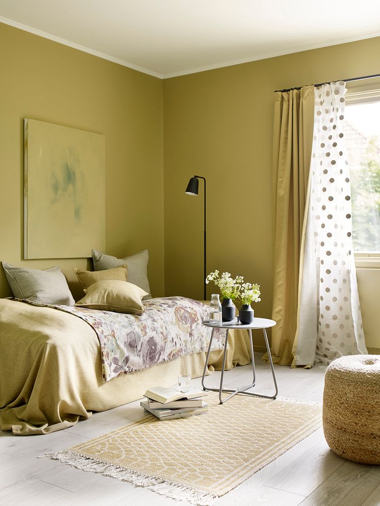 Velg en farge på gardinen som matcher perfekt til veggen! Slik får du rommet til å virke større. Blanke flater er på vei inn igjen. Stofflighet og mønstermiks med polkadotter, store blomster samt en kombinasjon av blanke og matte tekstiler, gir rommet et lekent preg. Legg merke til den vakre detaljen på fôret til hovedgardinen.