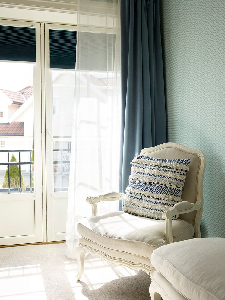 På soverommet ønsker vi det mørkt, og derfor passer det perfekt med en lystett Duette-gardin! Gardinens nesten papirbrettede karakter, gir en følelse av letthet, selv når den er helt tett. De vakre gardinene med wavebånd gir dessuten rommet et koselig preg.