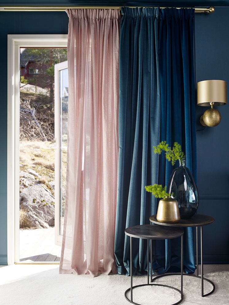 Ved å la en sheers fange dagslyset, unngår du den harde lyskanten som ellers oppstår når lyset treffer en helt tett gardiner. Prøv selv! Gardinens egen farge kommer også mye bedre frem når den får en transparent venn.