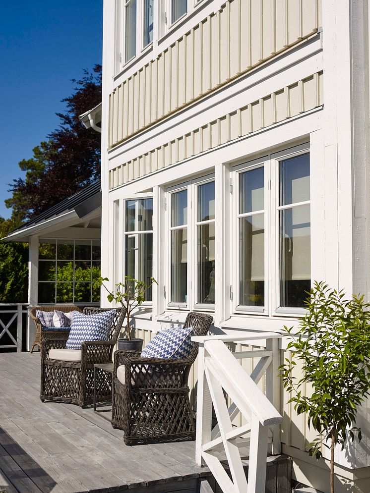 De står godt til naturens egne himmelfarger, og gir en myk overgang til naturen og det grønne. Den mørke fargen fremhever husets arkitektur, og kombinert med hvite detaljer får huset et rent og definert uttrykk.