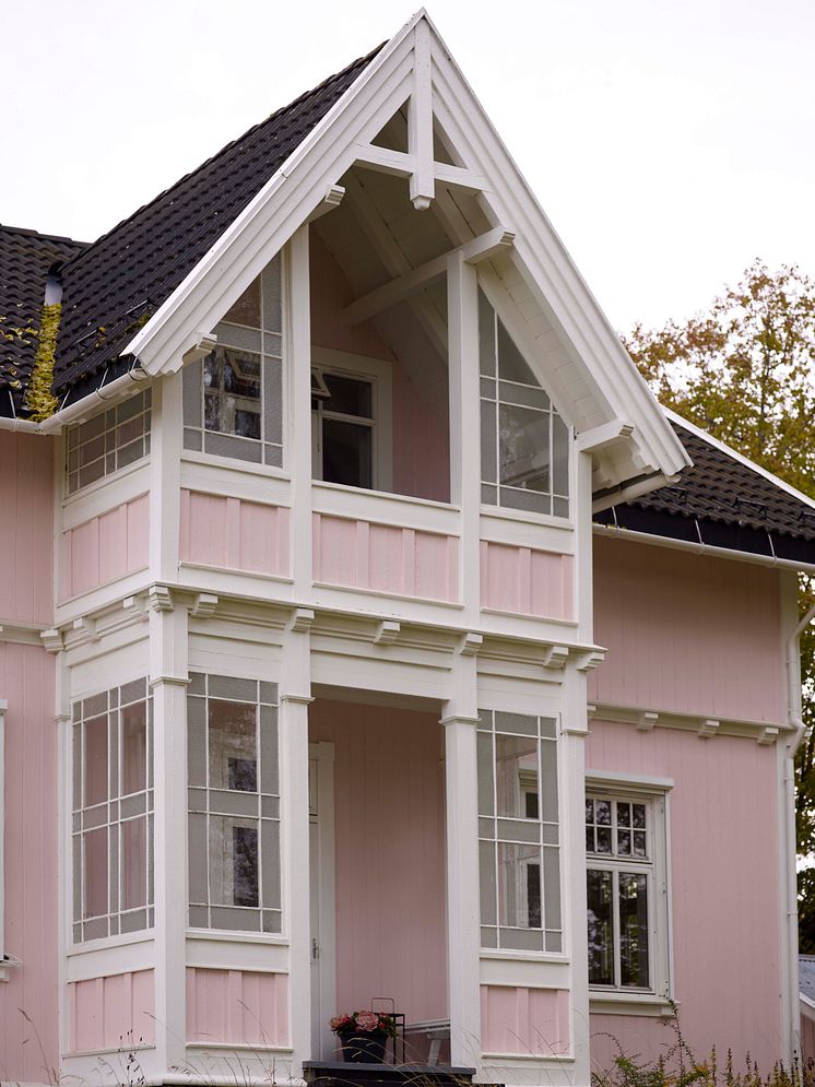 Rosa er en varm og tradisjonell farge som er mye brukt på bygårder. Vi i Fargerike ser gjerne flere privathus som våger å skille seg ut like vakkert. Som et sukkertøy med sin overraskende farge, gir rosa hus både glede og variasjon. Harmonisk med hvite og grå detaljer og en dør som virkelig ønsker velkommen inn!