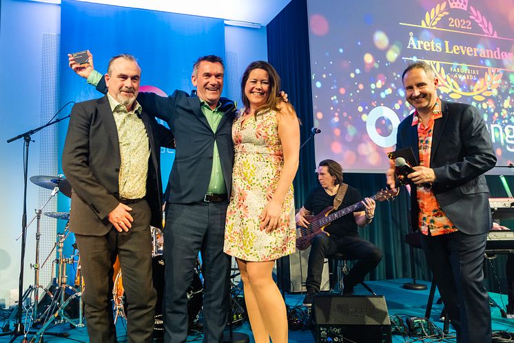 Årets leverandør, Audar Dørum og Helge Snilsberg fra Farveringen Gulv. Prisen ble delt ut av Tale Henningsen.