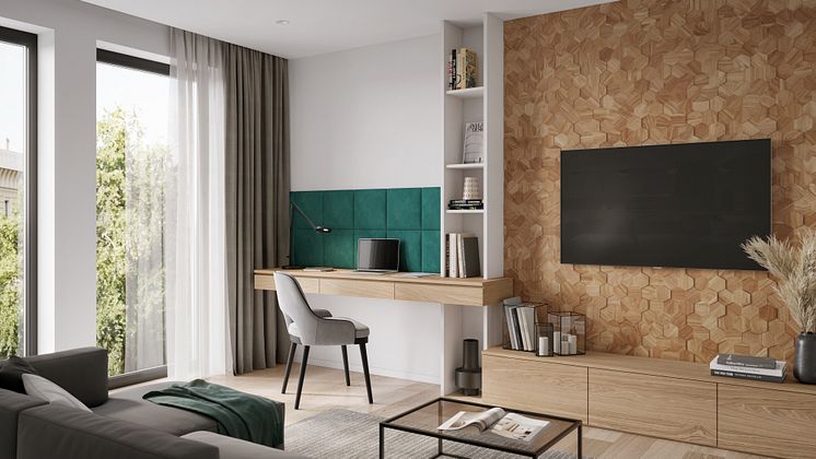 Til slutt har vi tekstiltrukne plater i firkanter og hexagon. Det er fem ulike farger å velge mellom. Tekstilet er i en tidsriktig velour og gir veggen et mykt sofistikert preg. Både tekstil og polstring er laget av 100% resirkulert materiale, som gir god lyddemping. Det eneste du trenger til disse er en slett vegg hvor den dobbeltsidige tapen bak platene festes.