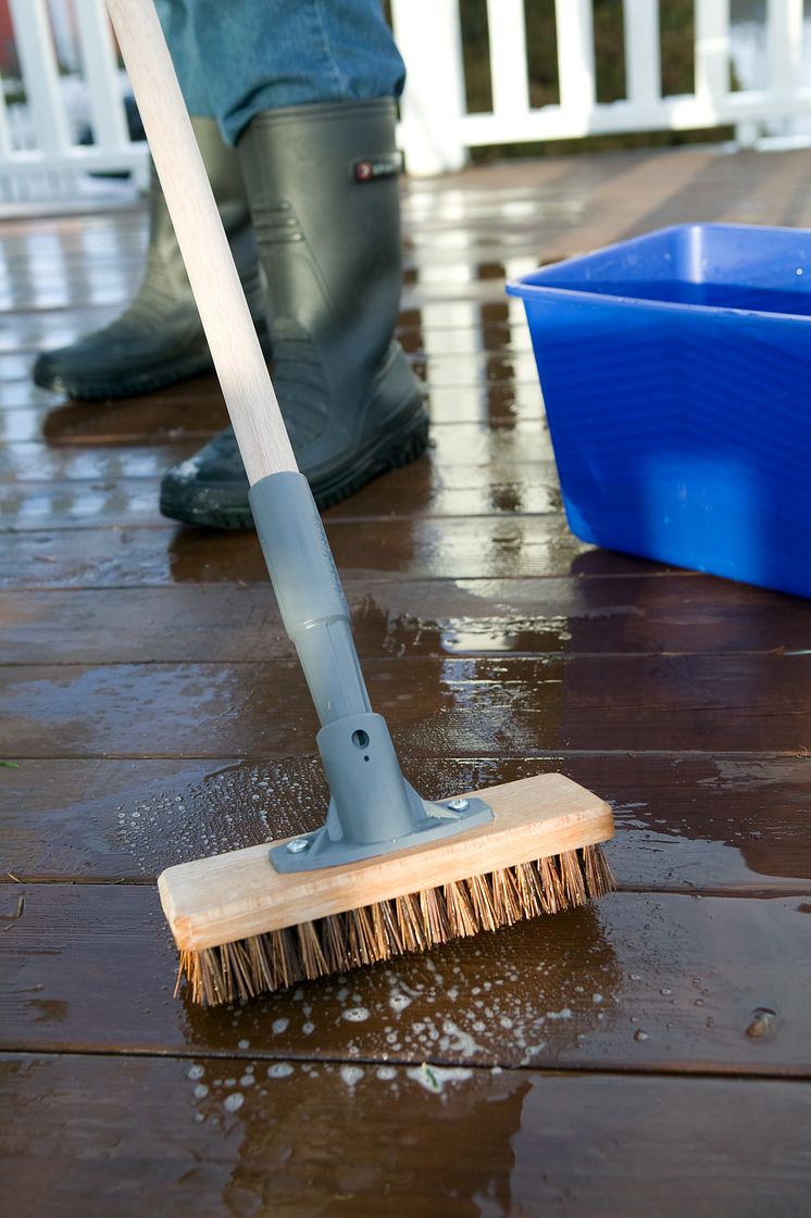 Regner det, fortvil ikke. Det passer fint å vaske terrassen i slikt vær. Så fort dekket er tørt, kan du starte med behandlingen.