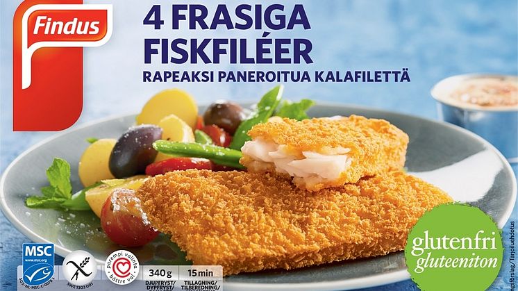 Findus, landets ledende produsent av dypfryst mat, introduserer et glutenfritt fiskefiletalternativ for folk som har diagnosen cøliaki. «4 Frasiga fiskfileér» er navnet på det nye produktet, som er et glutenfritt alternativ til alle som er glad i panert fisk. Produktet inneholder 59% fiskefilet og pakken inneholder fire fileter. Fiskesorten er Alaska Pollock. Alaska Pollock er nært beslektet med torsken, og har samme milde, gode smak.