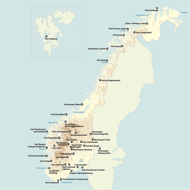 Jotunheimen, Kragerø Næringsforening, Visit Sørlandet, Visit Lillehammer, VisitLindesnes, Destination Lofoten, Visit Lyngenfjord, Lysefjorden365, MTNU/Visit Midt-Telemark, Malung-Salen, Visit Narvik, Nasjonalparkriket, Visit Nesbyen, Visit Nordfjord,Visit NorthWest, Visit Norefjell, Orinor/Visit Kirkenes & Alta, Nordveggen/Visit Rauma,visitRjukan, Visit Senja, Visit Sognefjord, Region Stavanger, Næringshagen i Ryfylke/VisitSuldal, Visit Sunnhordland, Visit Svalbard, Visit Tromsø-regionen, Destinasjon Trysil,Visit Valdres, Vefsna Regionalpark, Vest-Telemark, Visit Vestfold, Visit Øst-Norge, VisitVoss og Åfjord utvikling. Desse reisemåla representerer reiselivet i over 137 kommunarog ei medlemsmasse på omlag 4500 reiselivsbedrifter. Les meir her:https://berekraftsnettverket.n...