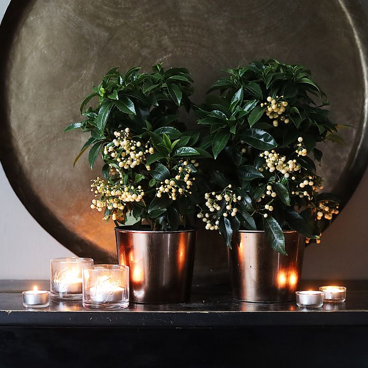 Ardisia med hvite bær i metallpotter foran rundt metallfat. Telys.