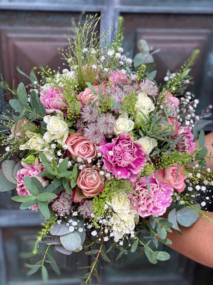 Frodig brudebukett med rosa roser, nellik og stjerneskjerm, hvite roser og brudeslør, samt grønt og gult og strå.