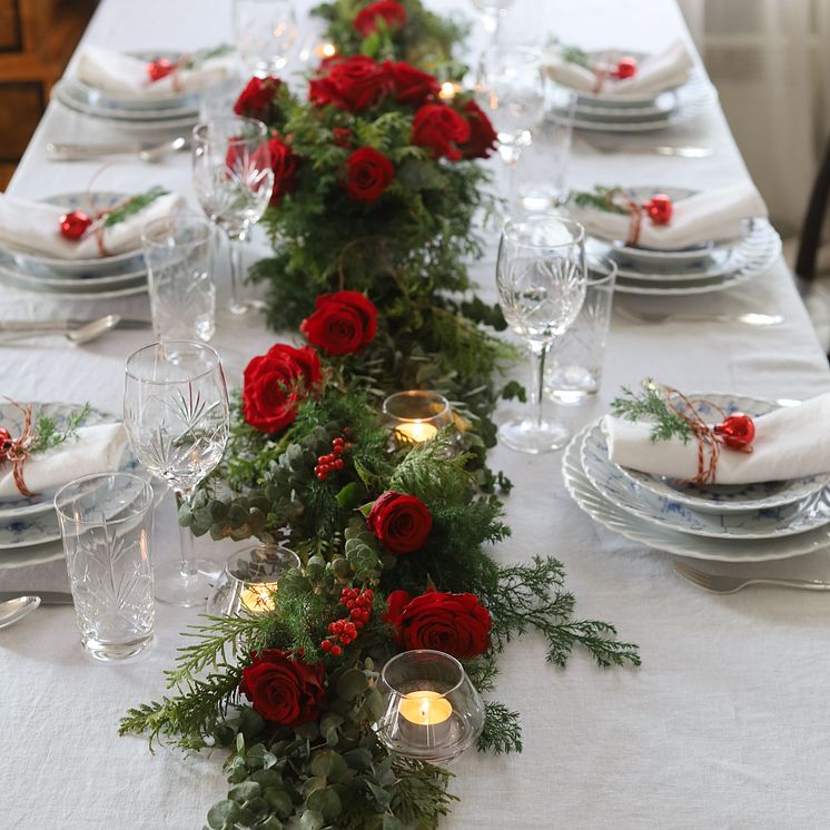 Bord dekket med borddekorasjon med røde roser, bær og grønt.