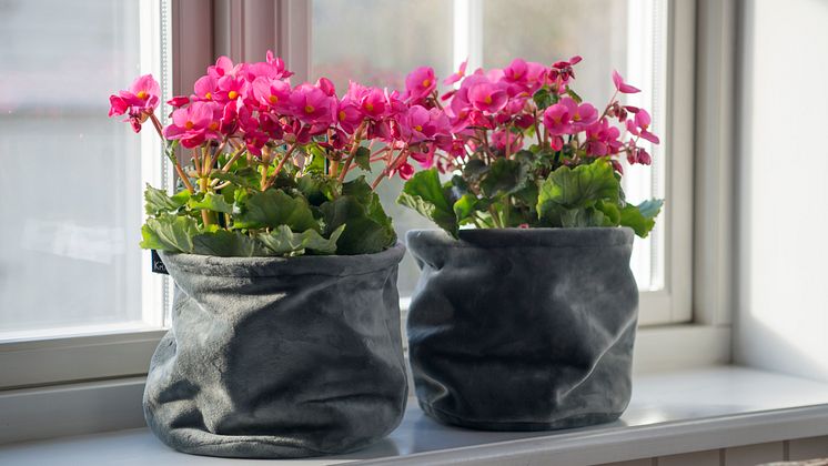 Julegleder i grå posepotter i vinduskarm