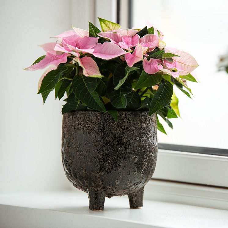 Rosa julestjerne i rustikk mørkebrun potte med ben