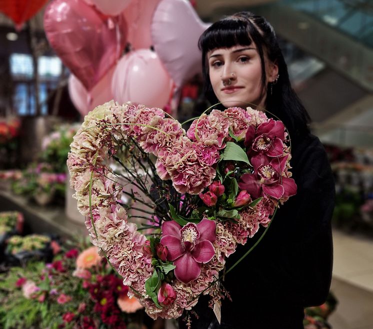 Floriss Råholt med hjertebukett i rosatoner. Orkide symbidium, alstromeria og nellik.