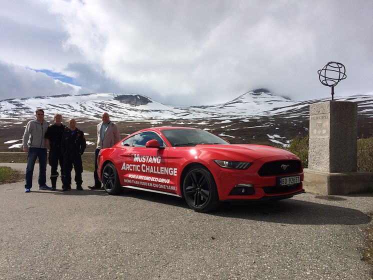 Knut og Henrik satte verdensrekord med sportsbilikonet Ford Mustang. Her ved Polarsirkelen før avreise