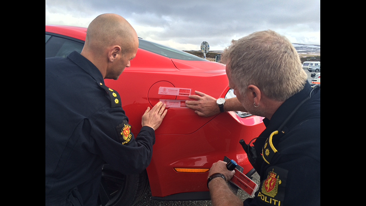 Knut og Henrik satte verdensrekord med sportsbilikonet Ford Mustang. Her ved Polarsirkelen før avreise og politiet forsegler drivstofftanken