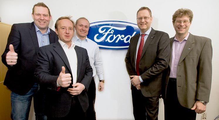 På bildet: Fra venstre Kjetil Hagestande adm. dir. RøhneSelmer, Christian August Selmer, styrelder RøhneSelmer, Fredrik Selmer, styreleder Selmer Eiendom; Per Gunnar Berg, adm. dir. Ford Motor Norge og Jon Christian Fleischer, forretningsutvikler Ford Motor Norge