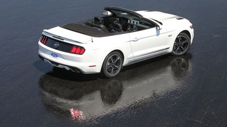 - Mustang California Special byr på en moderne vri på en Mustang Special Edition som første gang ble introdusert i 1968. I tillegg til egne logoer og sportsstriper på siden i fargen grå og Rave Blue, inneholder designpakken også flere særegne interiørdetaljer i fargen Navy Pier.