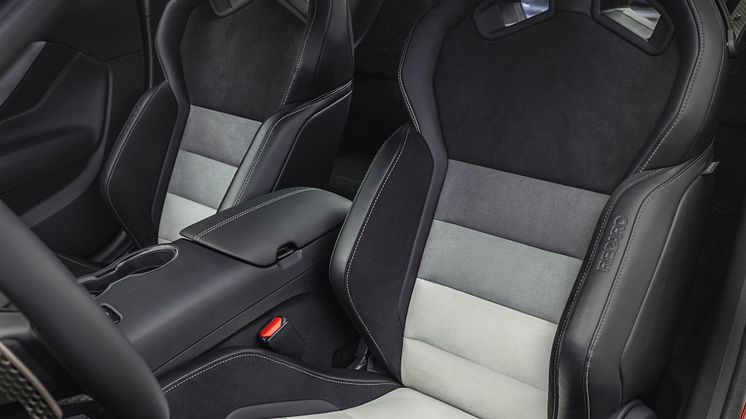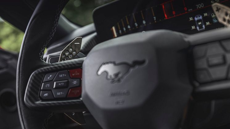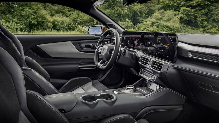 Interiøret i nye Mustang GTD blir også vist frem for første gang på Le Mans. Det flatbunnede og polstrede GTD-rattet med premium Dinamica- og karbonfiberdetaljer kommer med eksklusive knapper for å justere demping, stivhet og eksosmodus. Fra Recaro-setene, som er standard, kan førere derfor ha fullt fokus på veien, samtidig som de kan justere for å ta svingene best mulig, eller velge lyd ved akselerasjon.