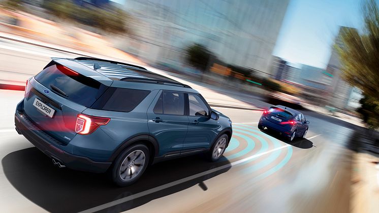 - Adaptiv cruisekontroll med køassistent og filsentrering: Teknologien hjelper Explorer med å opprettholde en komfortabel avstand til kjøretøyene foran, og bidrar i tillegg til å holde kjøretøyet sentrert i veibanen. I tillegg kan teknologien justere hastigheten innenfor lovlige grenser ved å overvåke trafikkskilt i tillegg til bruk av informasjon fra navigasjonssystemet.