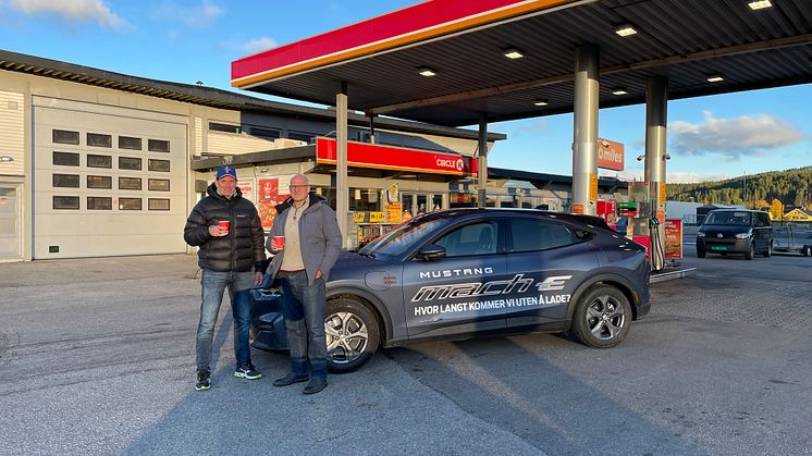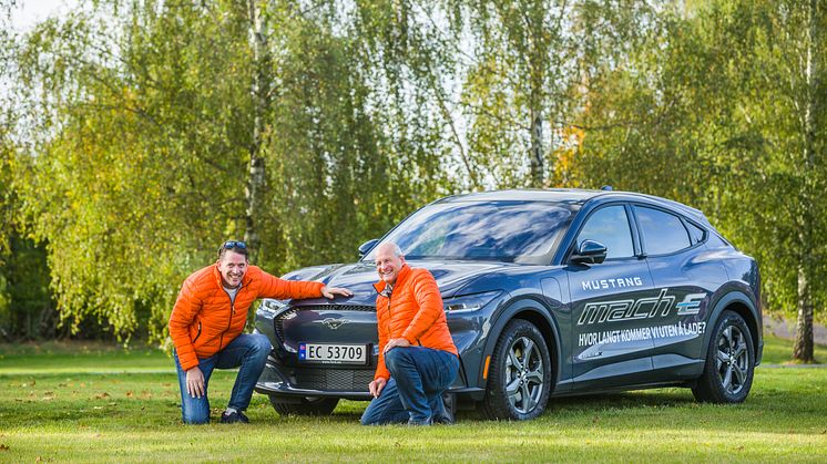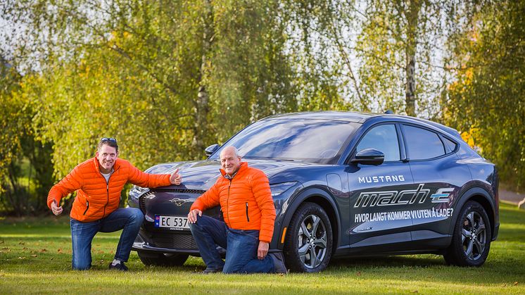 De to erfarne økosjåførene Henrik Borchgrevink og Knut Wilthil kjørte i helgen en Mustang Mach-E Long Range med bakhjulstrekk hele veien fra Trondheim i nord til Kristiansand i sør, en strekning på hele 807,2 kilometer, uten å lade underveis.