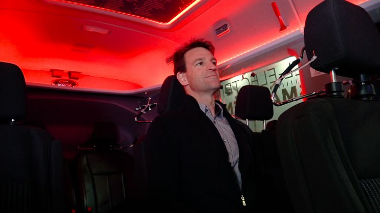 Ulike farger på innvendig belysning skal spare strøm for Fords nye helelektriske minibusskonsept Transit Smart Energy Concept.