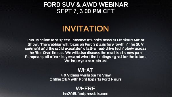 Før bilutstillingen i Frankfurt inviterer Ford til webinar («live» pressekonferanse på web/nett) om alle våre nyehter innen SUV-segmentet og nyheten om AWD på svært mange av våre modeller. Her kan nevnes nye Mondeo, nye Mondeo Vignale, nye S-MAX, nye Galaxy, Kuga, Ranger og den store SUV’en Edge som kommer i 2016. Det er selvfølgelig med eksperter fra Ford Europa som vil svare på spørsmål avslutningsvis.