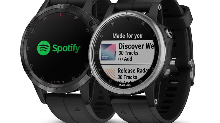 Garmin presenterer integrasjon med Spotify, verdens største musikkstreamingleverandør. Garmin-kunder, med Spotify Premium abonnement og en klokke i fēnix 5 Plus-serien, kan nå laste ned og lytte til musikk offline uten å behøve å ha med seg mobiltelefonen.